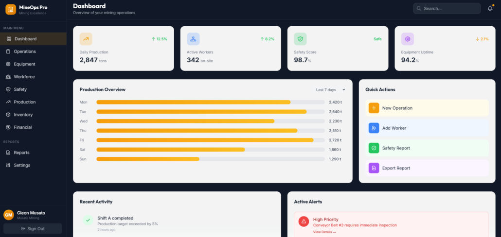 The Mining Operations Management System is a digital platform designed to manage mining activities, equipment, workforce, and compliance requirements. It enhances operational visibility, safety, and productivity in mining environments.